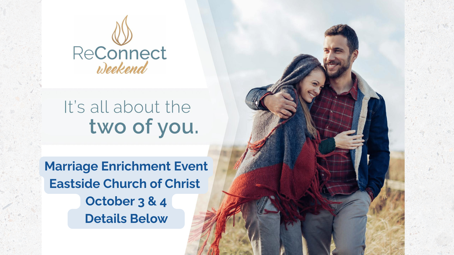 Couples, whether you’ve been married for 5 weeks or 50 years, you’re invited to attend the ReConnect Weekend Marriage Seminar designed to bring couples together by focusing their attention on the relationship spiritually, emotionally, and physically. More information will be coming soon but you can register here.